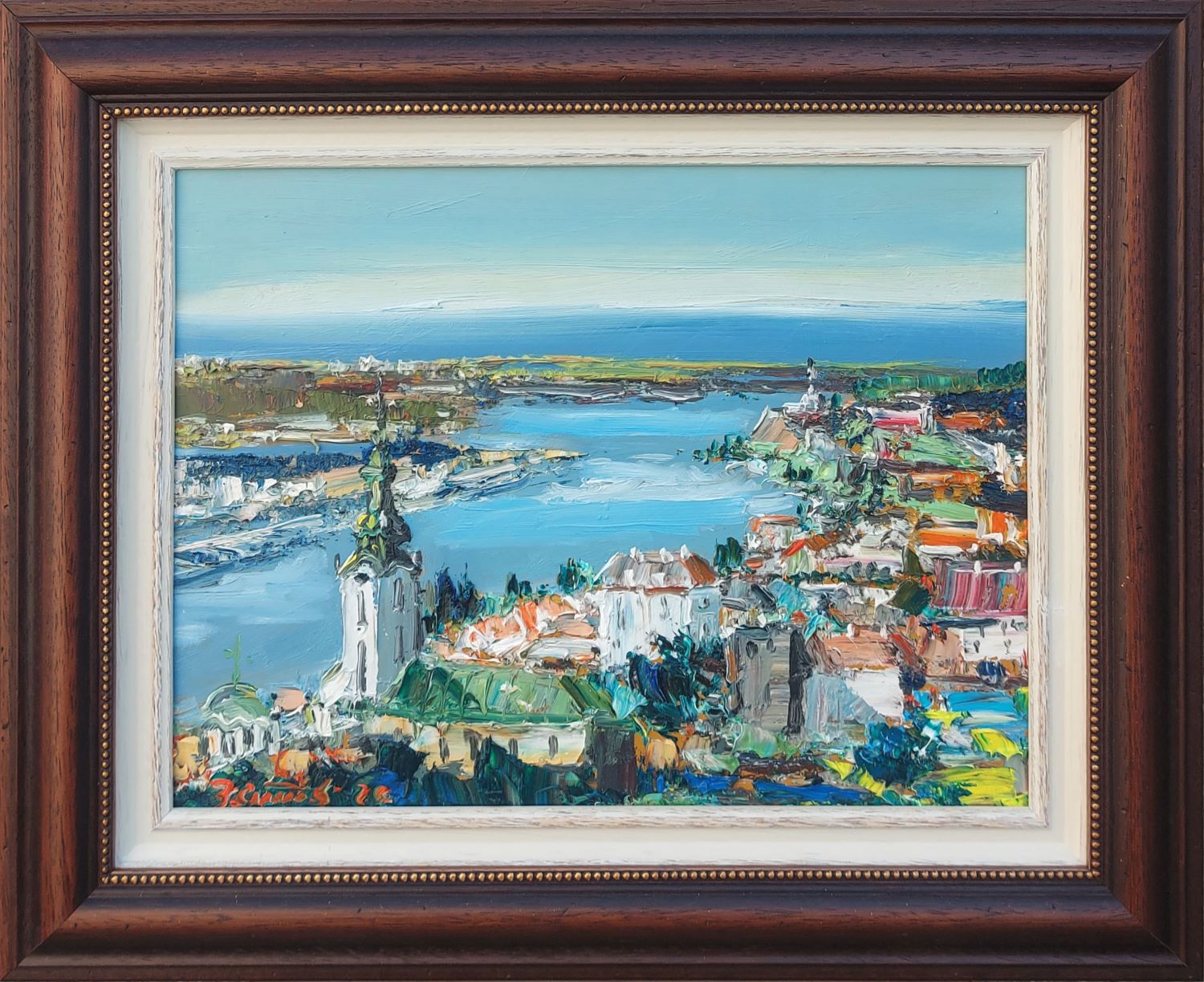 Painting of Đorđe Stanić – Ušće is a typical example of his painting. This artwork is painted with oil on canvas. Dimensions are 30 x 40 cm (without frame) and 46 x 56 cm (with frame). The price of the painting by Đorđe Stanić – Ušće is with a frame. The frame is wooden brown with beads, and the passepartout is wooden slip beige. The frame is selected with style and in accordance with the colors in the picture.