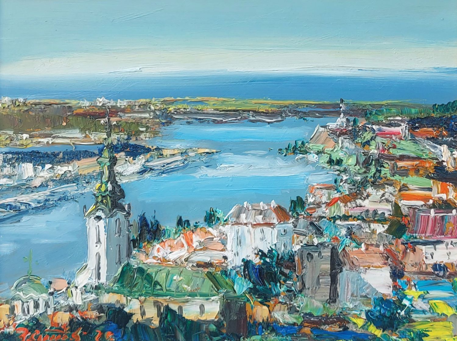 His oils on canvas are always full of colors and full-relief spread, which give a stamp to all his paintings.