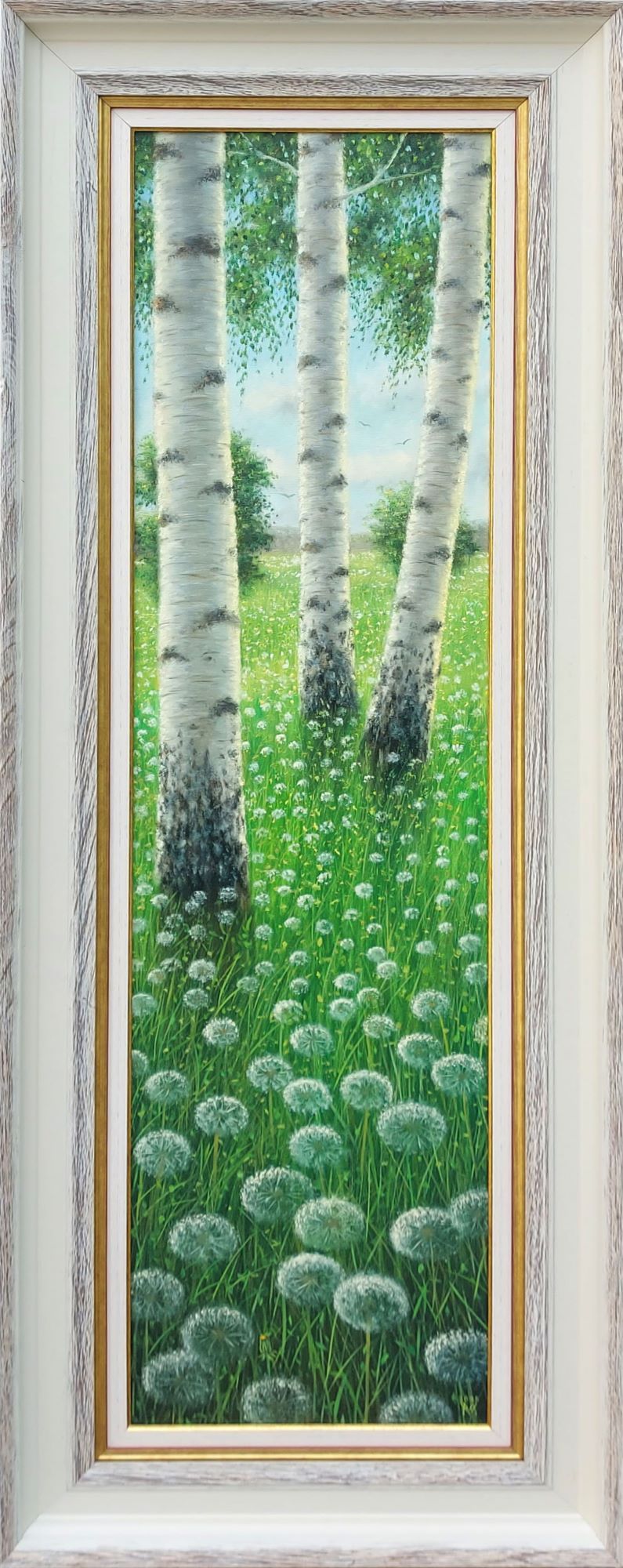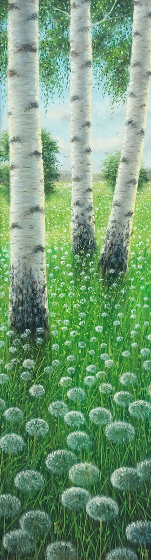 Painting of Miljan Vasiljević – Birch is a classic example of poetic realism and hyperrealism, for which this artist is widely known. This artwork is painted with oil on canvas. Dimensions are 100 x 25 cm (without frame) and 116 x 41 cm (with frame). The price of the painting by Miljan Vasiljević – Birch, is with the frame. The frame is a wooden white rustic, and the passe-partout is a beige frame with a golden slip. The frame is selected with style and in accordance with the colors in the picture.